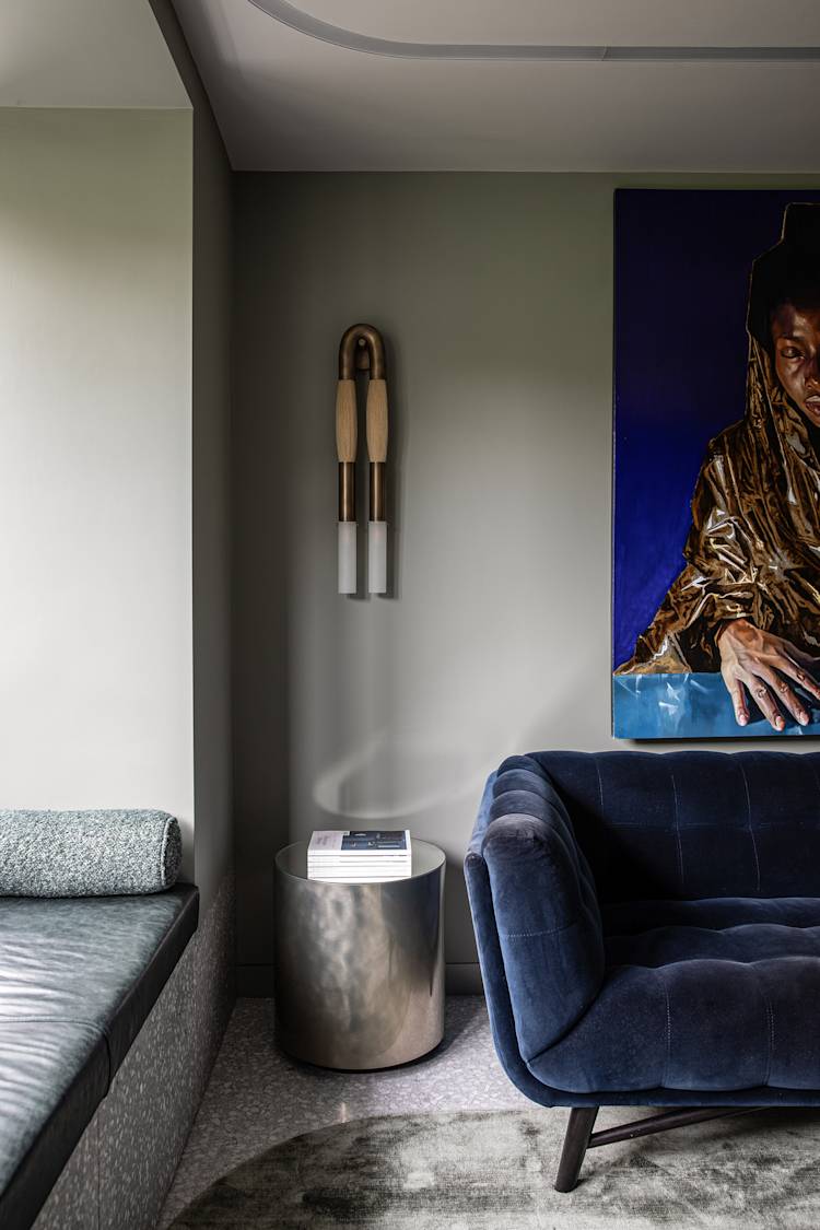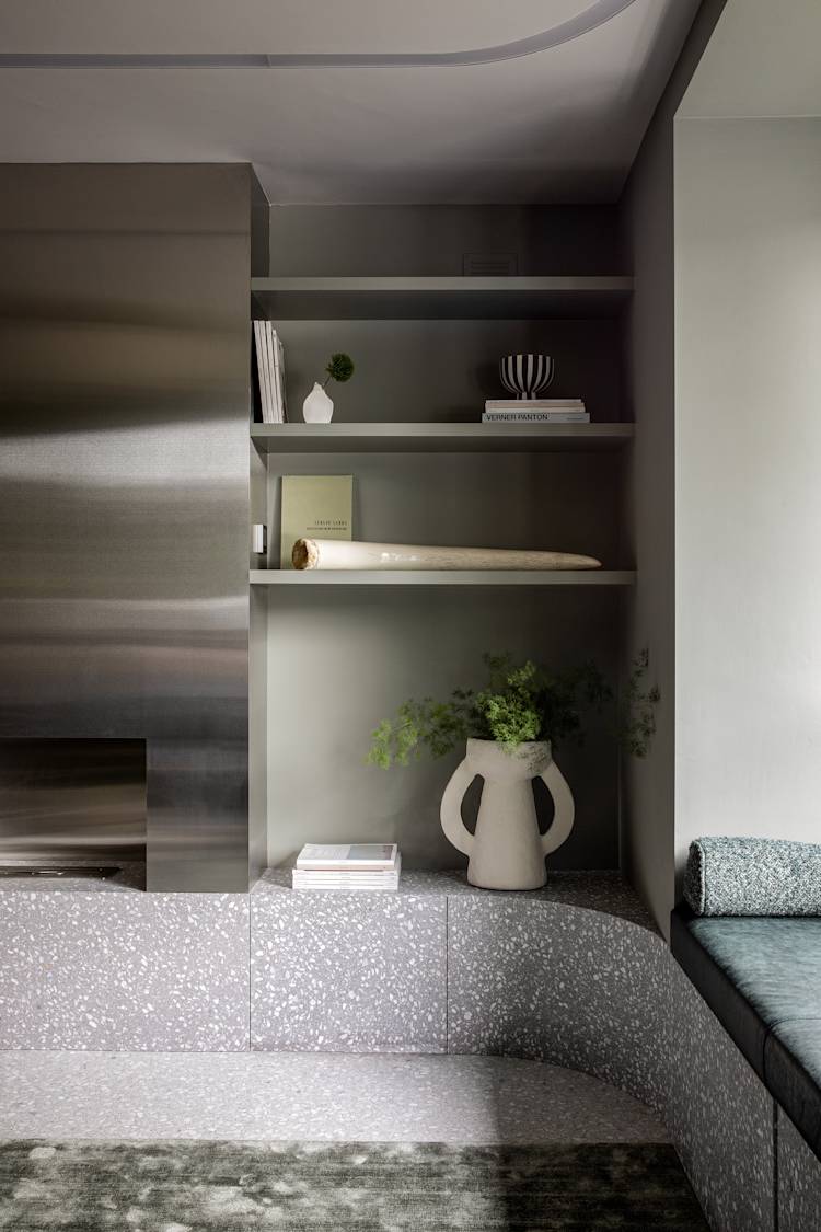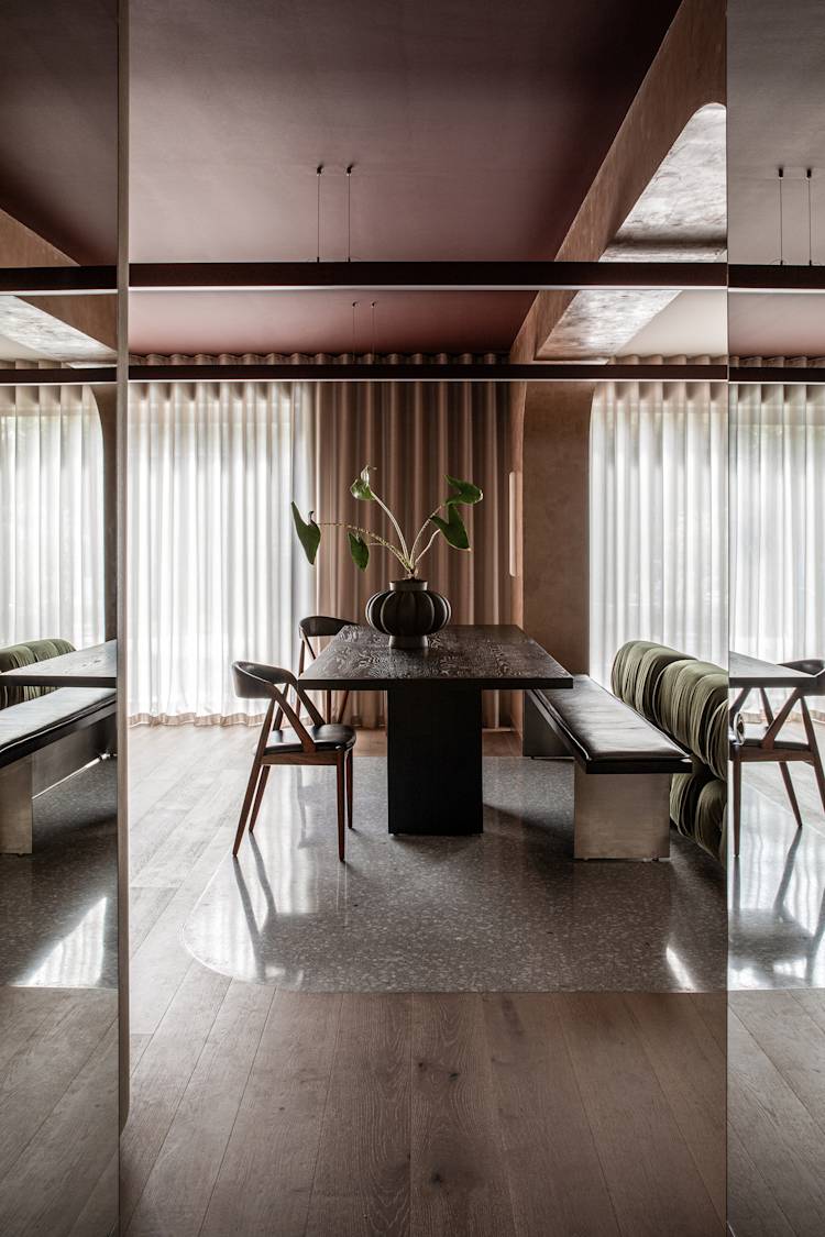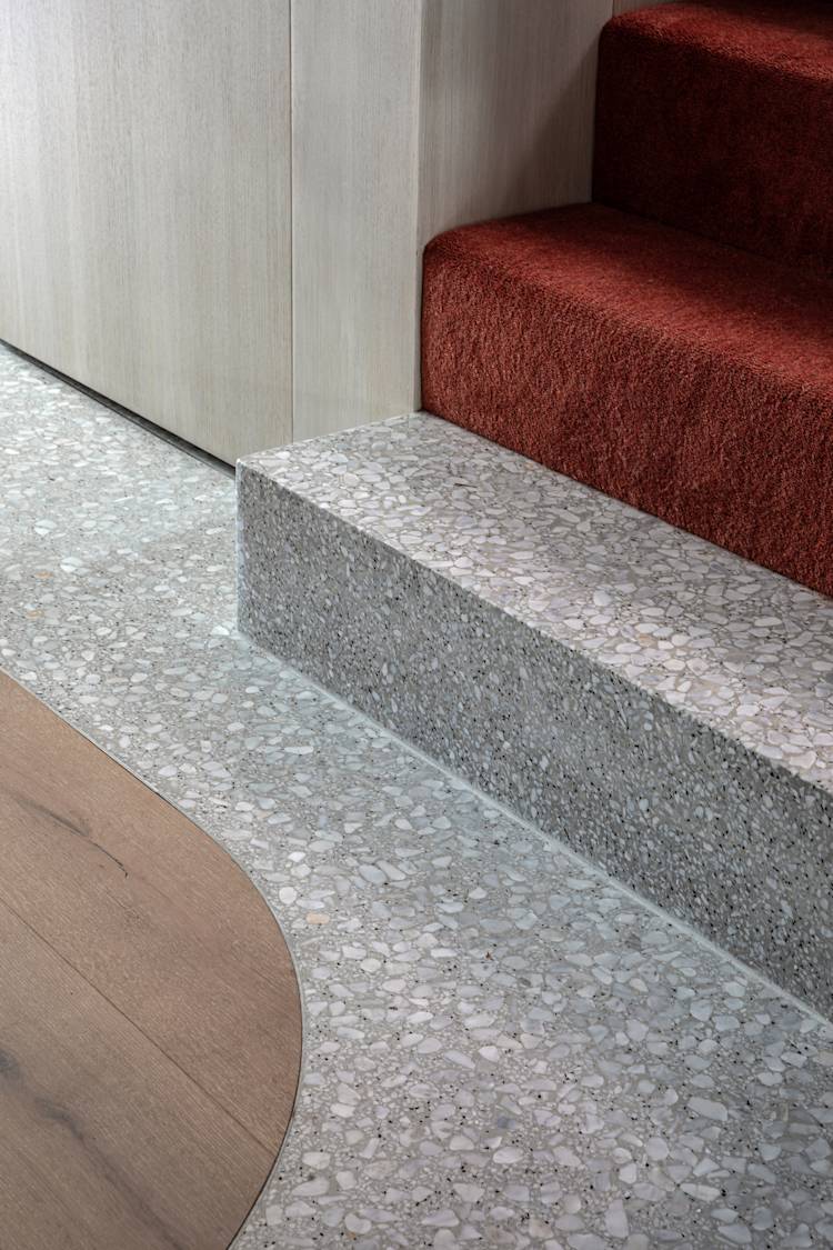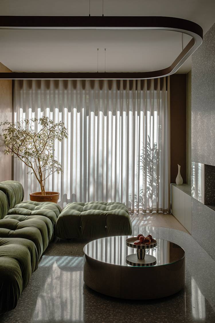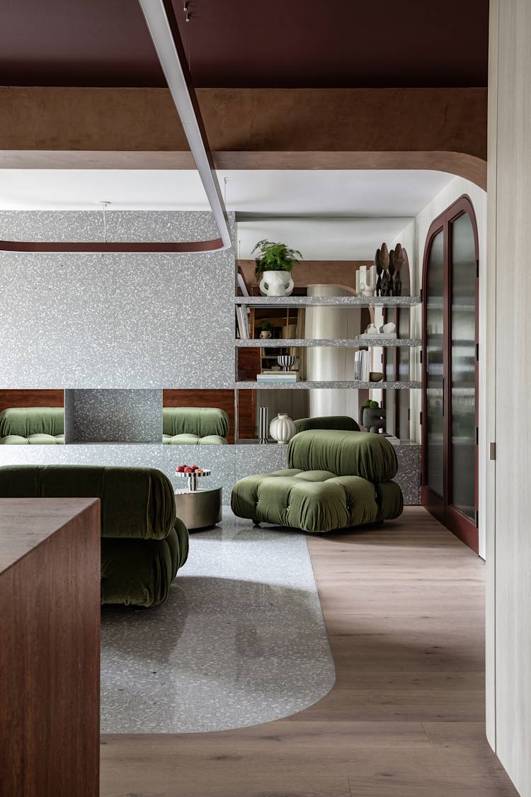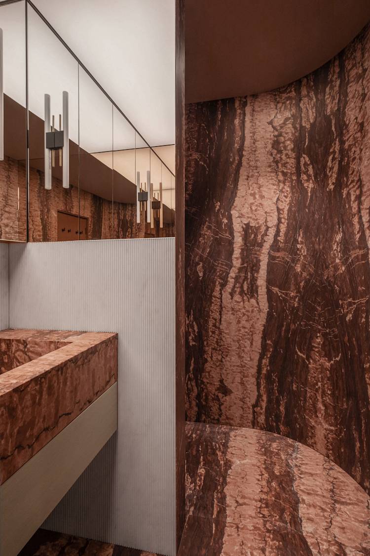 Curved doors, windows, floor patterns, lighting, and bespoke furniture reflect the repeated arc, creating seamless transitions between spaces. Materials blend and contrast to challenge norms, adding a unique graphic language to the interior.