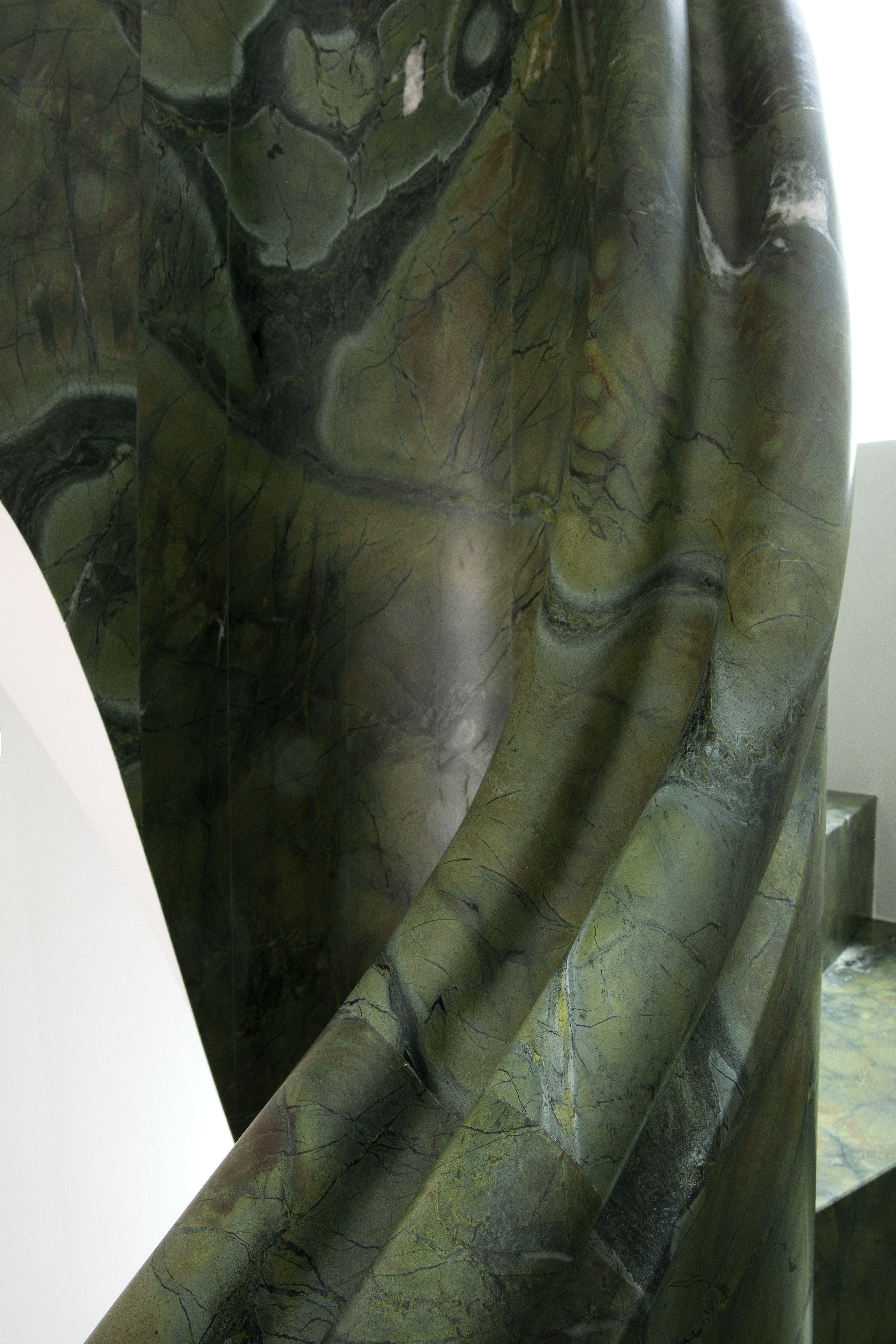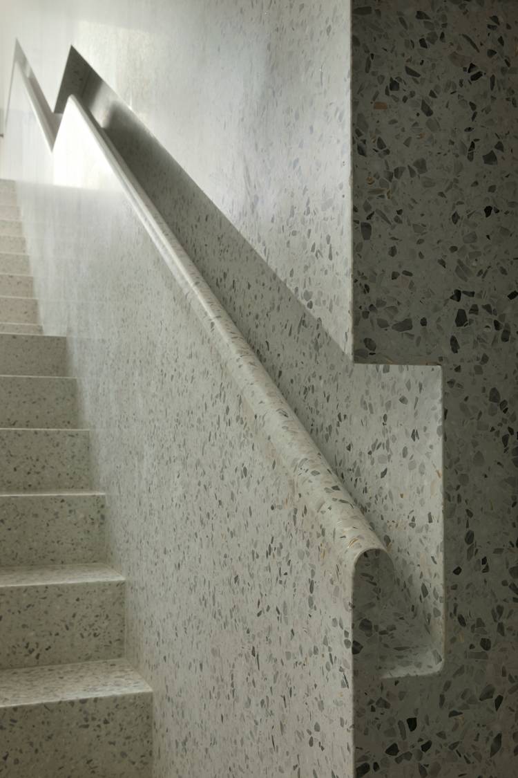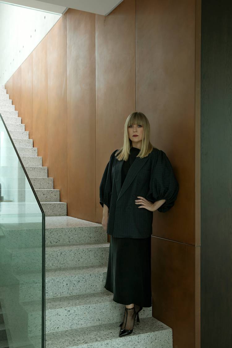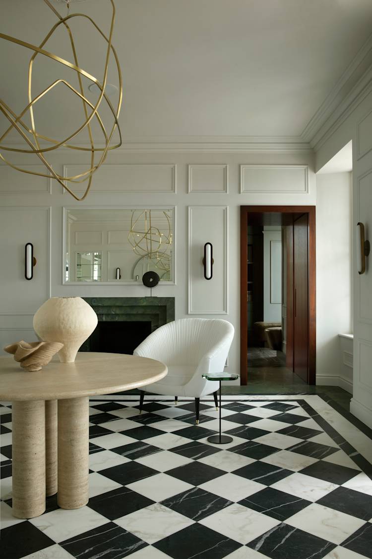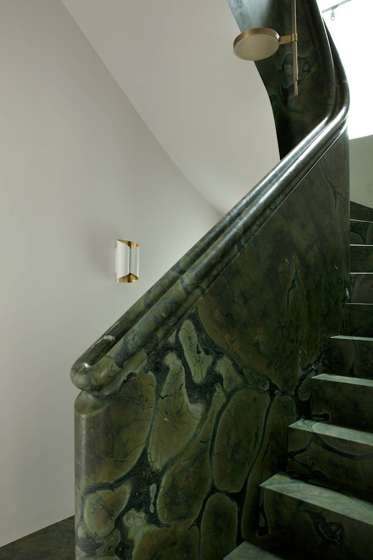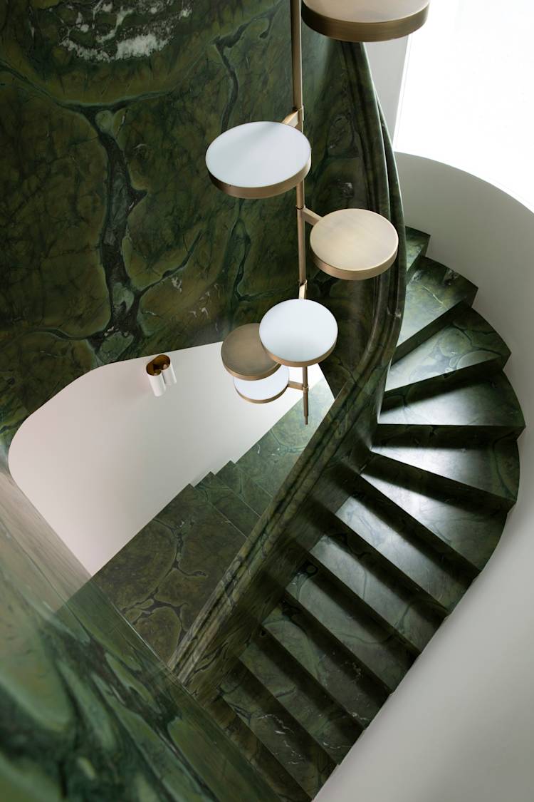 Balancing spaciousness with intimacy, the design emphasizes flow and light while celebrating craftsmanship through a striking, curved marble staircase, a sculptural focal point.