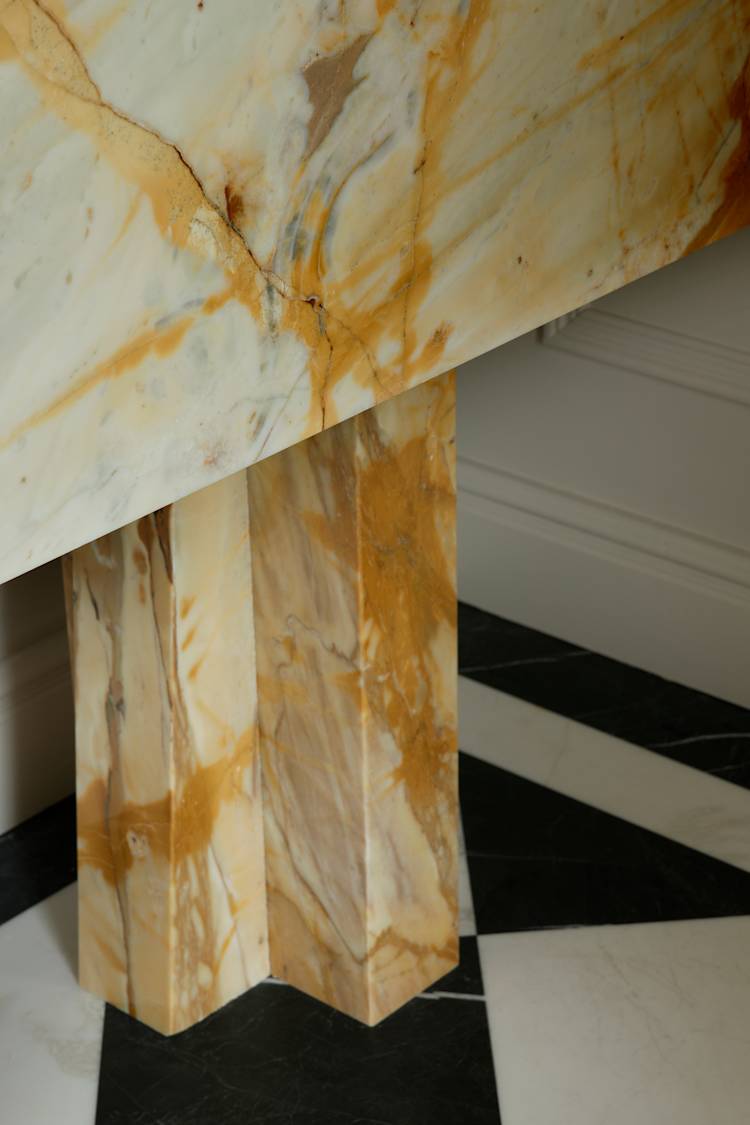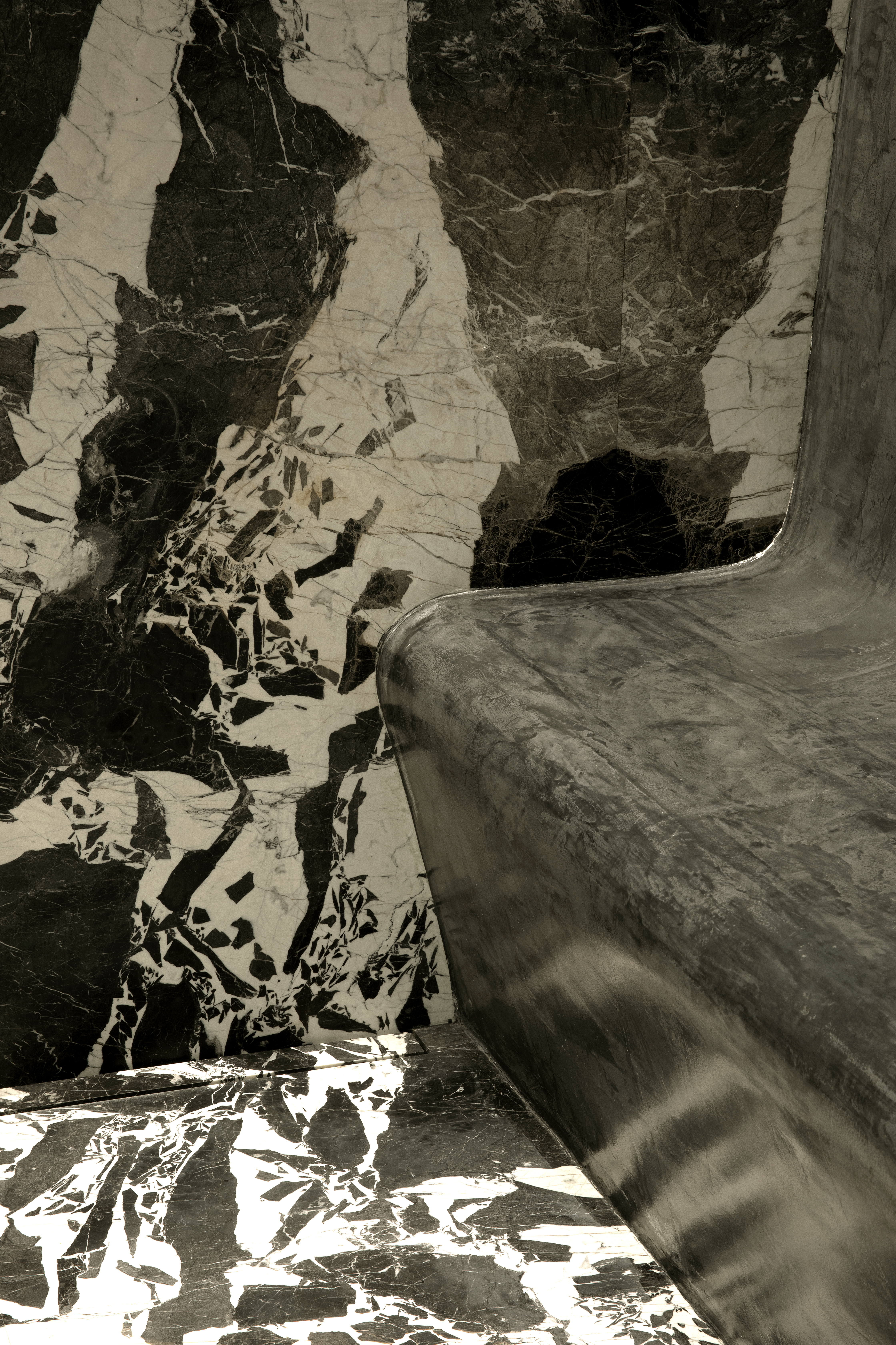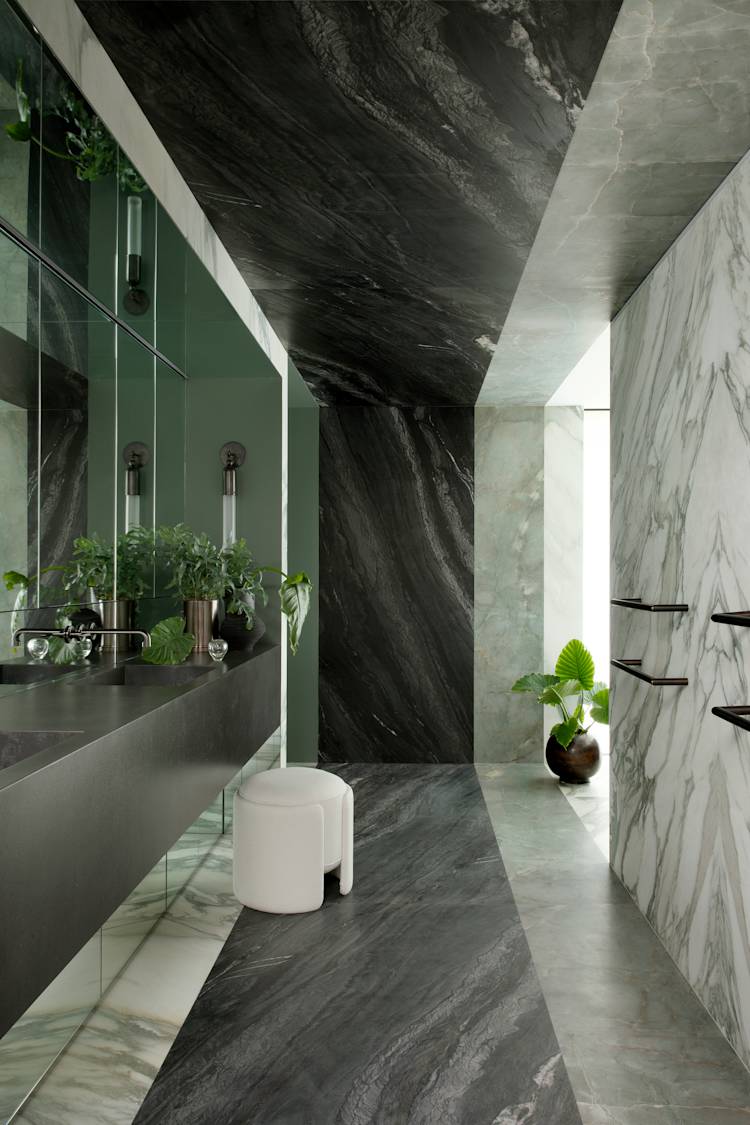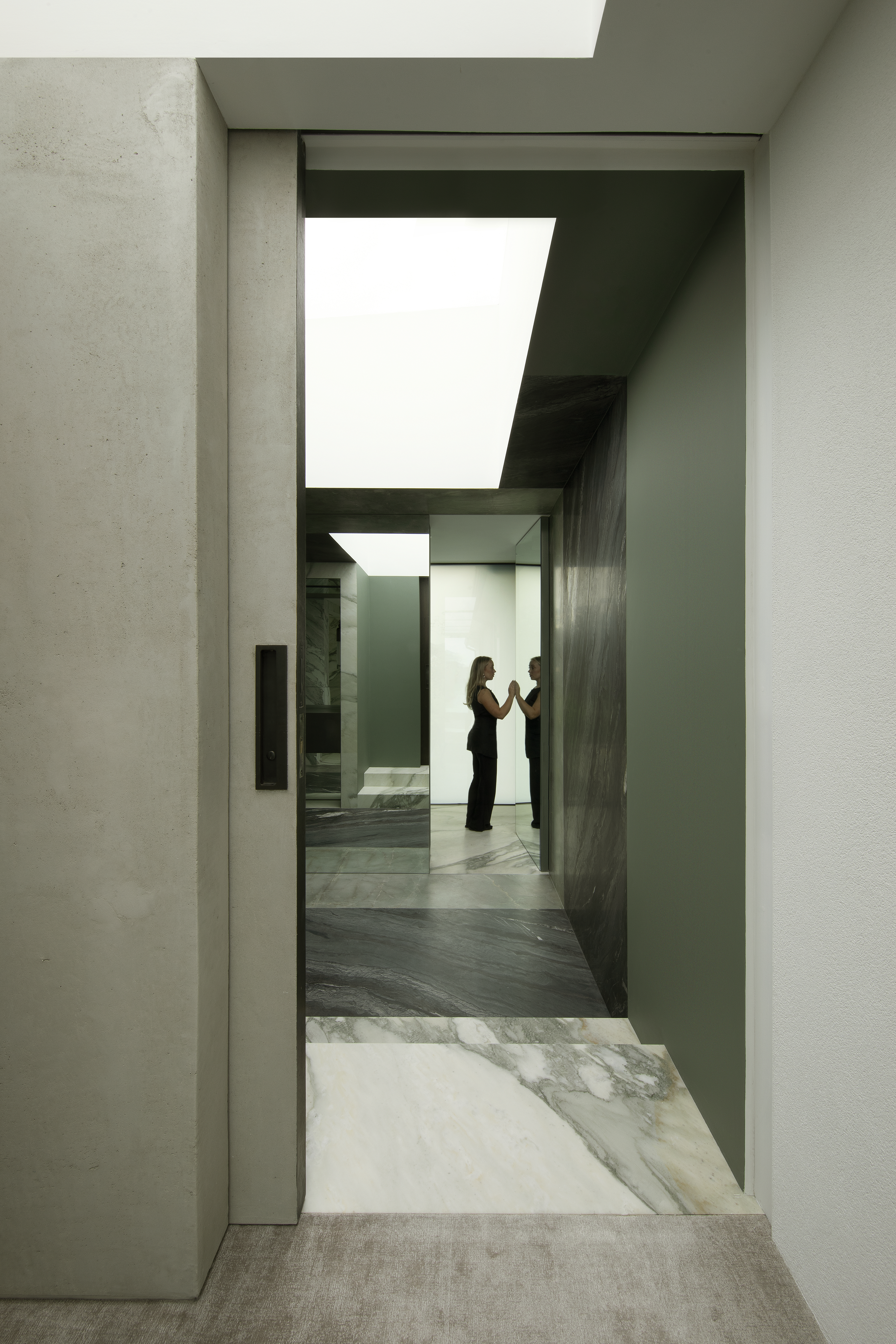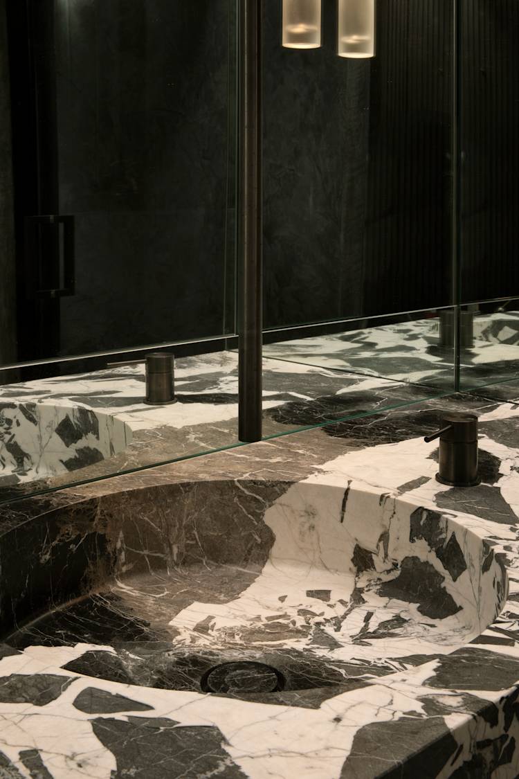 Balancing spaciousness with intimacy, the design emphasizes flow and light while celebrating craftsmanship through a striking, curved marble staircase, a sculptural focal point.