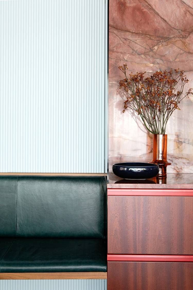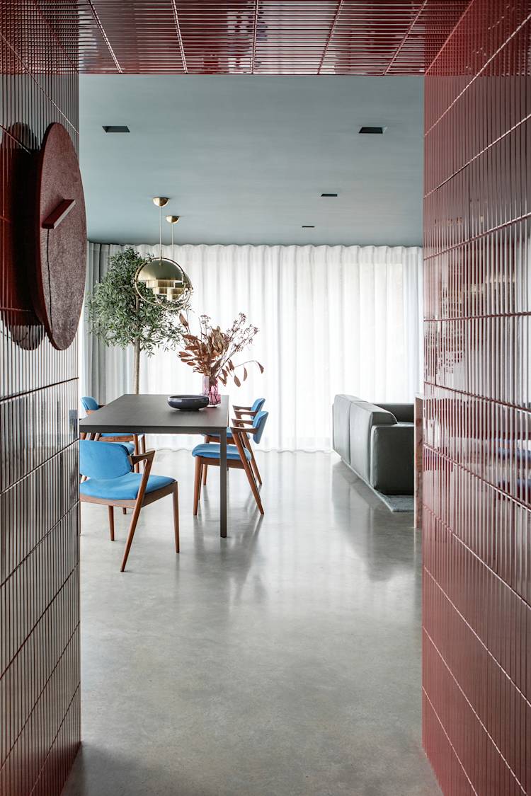 Materials merge, compliment and contrast in equal measure, culminating in an eye-catching, colourful and richly calm family home. There is a bold confidence in the saturation and depth of materials and spaces. The challenge was to balance the vibrancy of materials and design with the desired atmosphere and feeling, one of calm and homeliness. The result is a vibrant haven with an unexpected air of serenity.