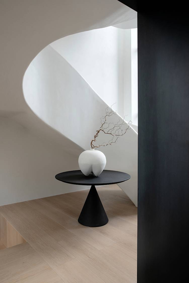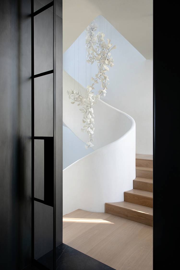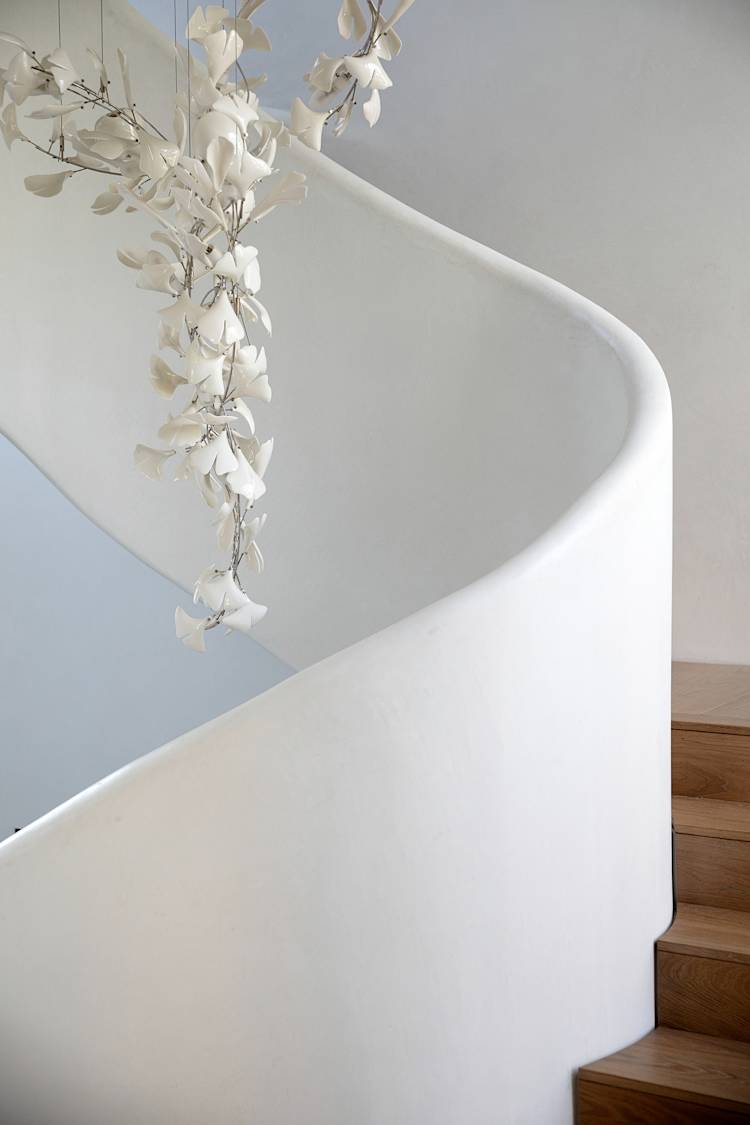 This Irish countryside farmhouse design aimed for spaciousness and comfort, harmonizing with its surroundings. Transparency and connectivity were emphasized, with a glazed structure linking old and new buildings, framing and celebrating the sculptural centrepiece of the house, the polished plaster, sweeping staircase.
