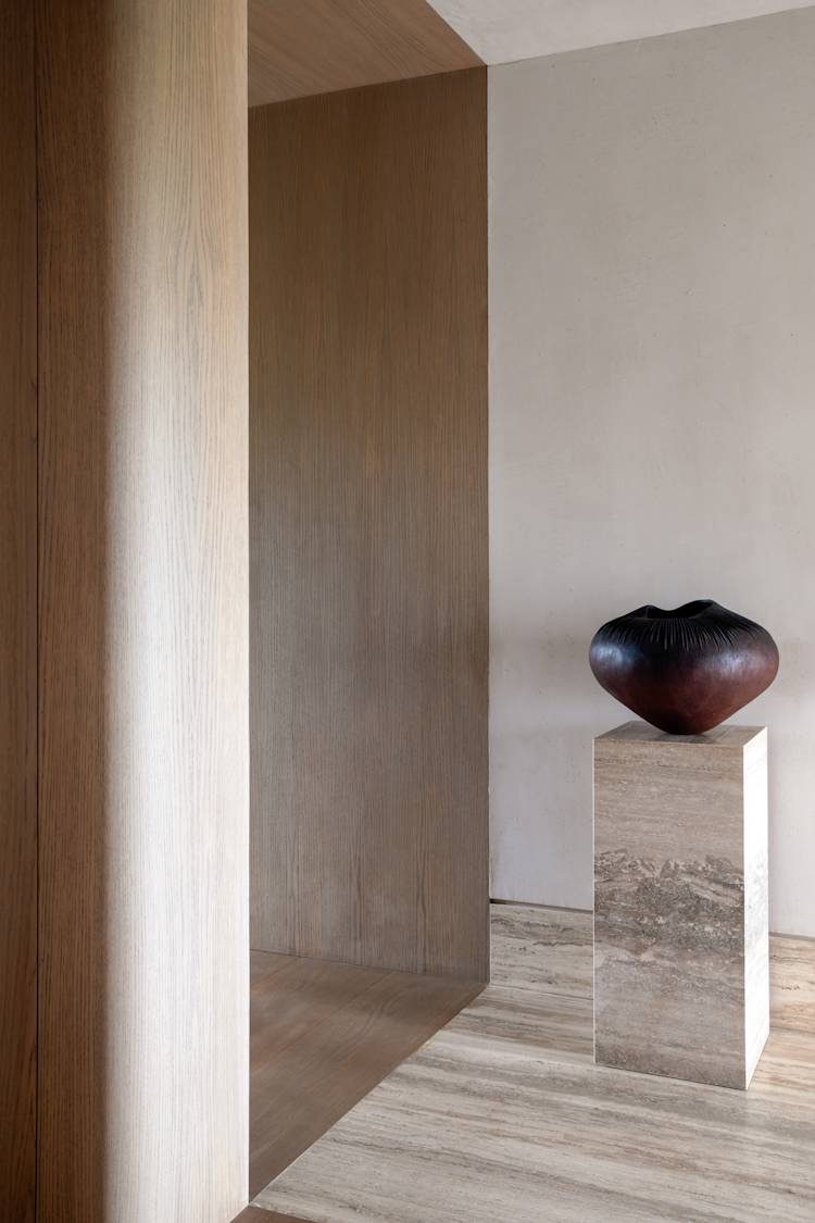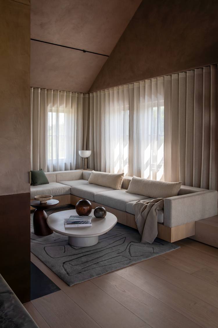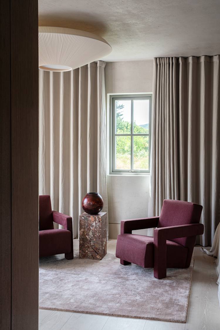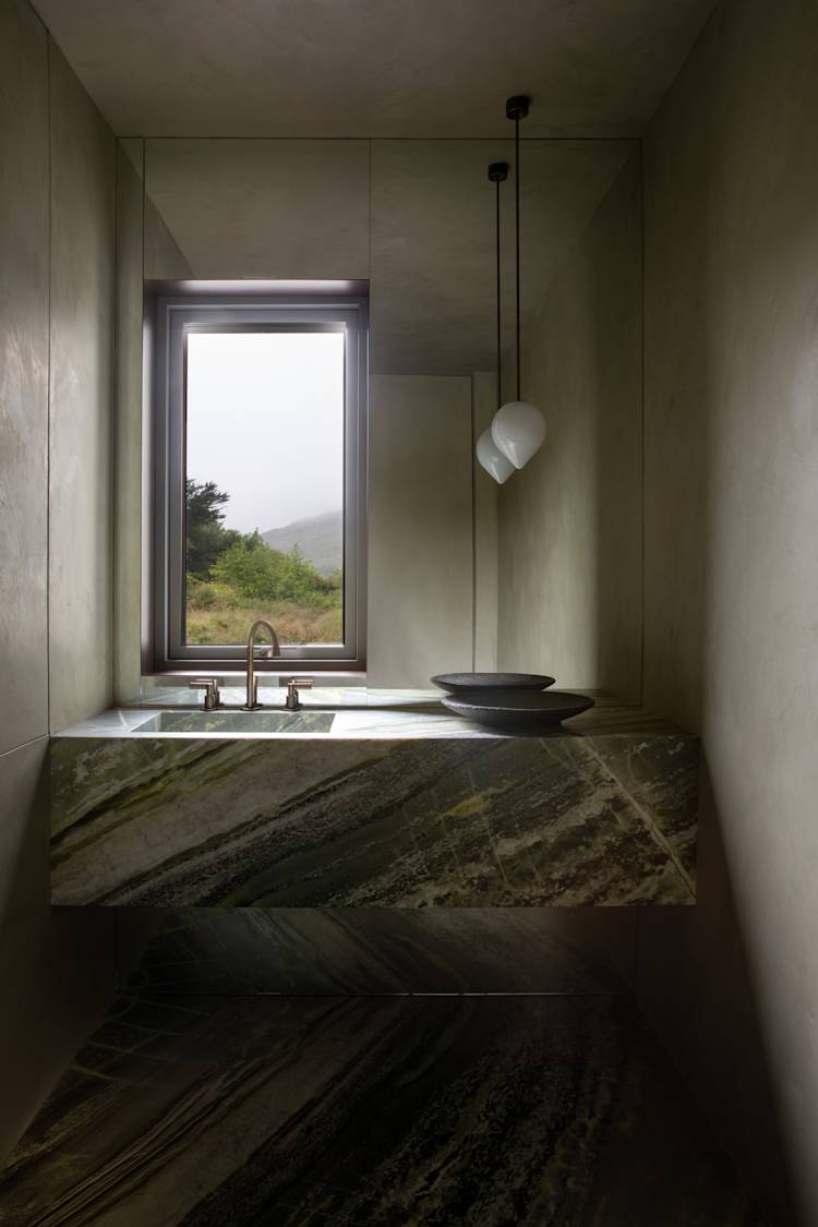 The Tonal Haven design aimed to create an intimate, serene space that harmonizes with its Connemara landscape setting. Emphasizing tonal cohesion and connectivity, the design integrates hidden doors and natural stone, celebrating material textures and adding depth with polished plaster and layered surfaces.