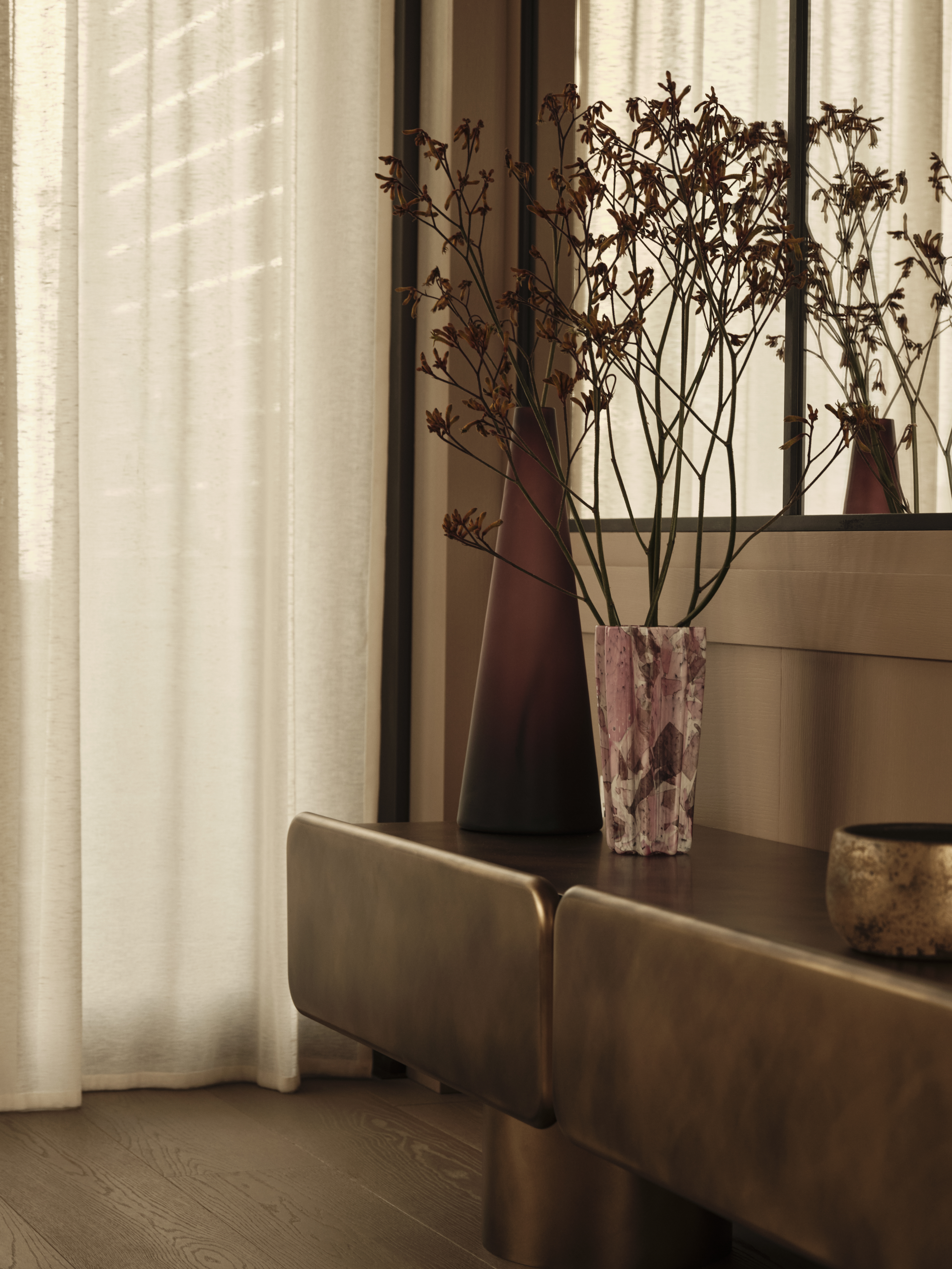 Soft, sky inspired and earthy hues flow through open-plan spaces, where sculptural furnishings, rich timbers, and artisanal finishes balance sophistication with warmth. Masculine materials are softened by rose-tinted hues and organic silhouettes, creating a dialogue between strength and serenity. Natural light becomes a central material, animating surfaces and enhancing the connection to the cityscape.