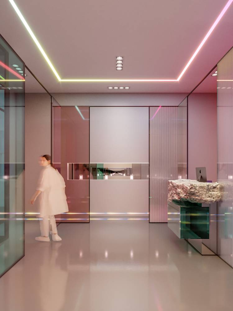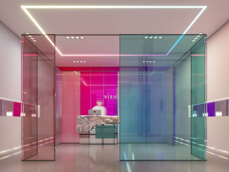 The design featured a gradient of colours, glass facades, glowing central cubes, and nature-inspired elements like rock rolls. Integrated LEDs diffused colour, creating a high-end yet welcoming environment. This design catapulted Sisu's growth across states, solidifying its position in the American aesthetic market.